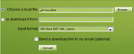 در این صفحه با جعبه سبز رنگی مواجه میشوید که عنوان آن Select File to Convert است. در این جعبه گزینه ای برای آپلود کردن فایل مورد نظر از روی سیستم خود یا دانلود مستیم آن از روی URL آن در یک وب سایت دیگر را در اختیار دارید: