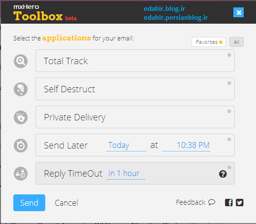 افزونه mxHero Toolbox افزونه ای است که چند قابلیت جالب توجه را به جی میل اضافه میکند یا به عبارتی فنی جی میل را Super Charge میکند. قابلیت هایی نظیر امکان فرستادن ایمیل هایی که به شکل خود به خود بعد از 5 دقیقه نابود میشوند، مطلع کردن شما از اینکه مخاطب مورد نظر ایمیل شما را باز کرده یا بر روی لینک ها و تصاویر موجود در آن کلیک کرده است، زمانبندی ارسال ایمیل ها، تنظیم «یادآوری» برای اینکه مخاطبی هنوز ایمیل فرستاده شده از سوی شما را پاسخ نداده است – در زمان دلخواه شما) و چند قابلیت دیگر.