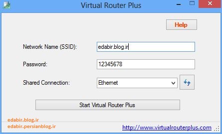 پس از اجرا ، تصویر زیر ظاهر شده و لازم است نامی برای SSID و رمز عبور موردعلاقه خود را نوشته وکانکشنی که به اینترنت وصل می شوید را از گزینه Shared Connection انتخاب و دکمه Start Virtual Router Plus را کلیک کرده تا اینترنت بصورت وایرلس به اشتراک گذاشته شود و دستگاههای دیگر از طریق WiFi قابل ارتباط باشد.