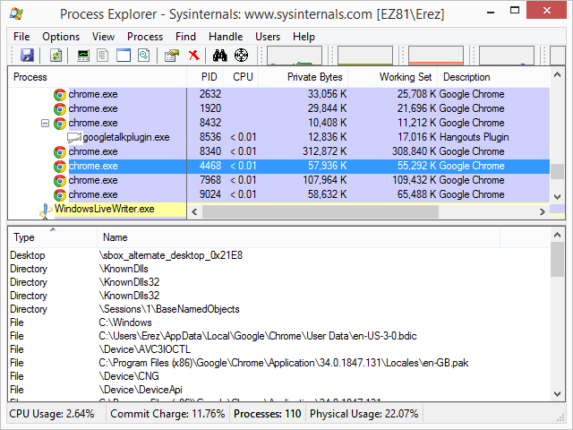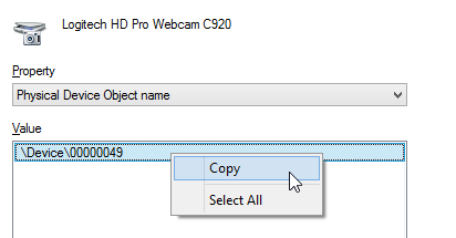 از اینکه نام وبکم خود را یافتید، به پنجره Process Explorer بازگردید و