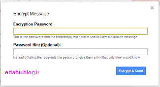 بعد از تنظیم محتویات و متن ایمیل و زمانی که بر روی دکمه Send Encrypted کلیک بکنید، پنجره ای برای دریافت رمز عبور و همچنین در صورت تمایل کلمه یادآوری رمز باز خواهد شد که در آن بایستی گذرواژه مورد نظر را که تنها شما و شخص مقصد از آن اطلاع دارد را وارد کنید: