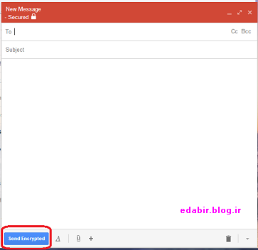 وقتی این افزونه را از App Store گوگل بر روی کروم نصب کنید، و وارد جی میل خود شوید، اولین تغییری که میبینید، این است که در کنار دکمه COMPOSE یک دکمه کوچک با تصویر یک قفل بر روی آن قرار گرفته است که مخصوص فرستادن ایمل های رمزگذاری و کد شده است.با زدن این دکمه پنجره فرستادن ایمیل در حالت کدگذاری شده باز میشود: